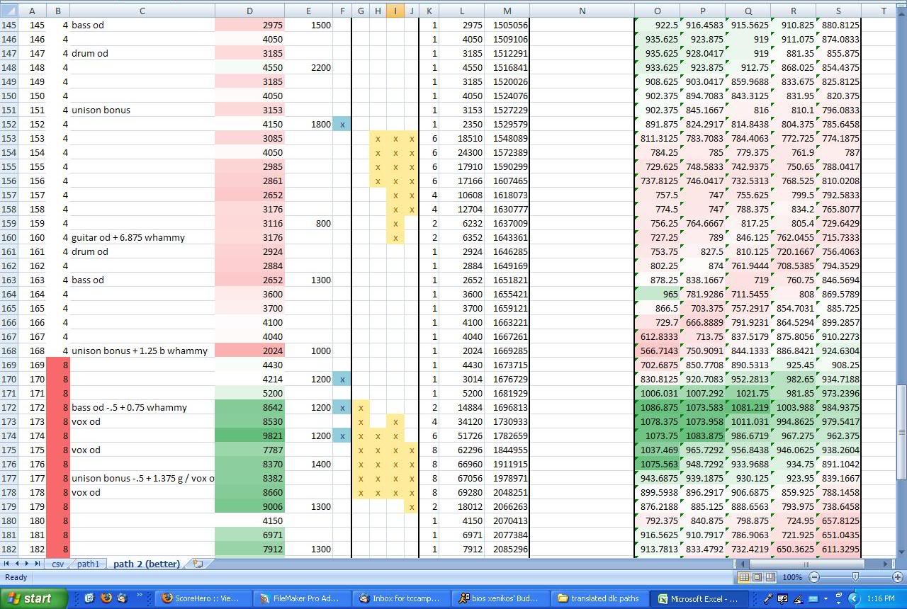 How do you go about making one of these paths? Well, on that path stats site, you want to copy out all of that into a blank spreadsheet (I keep a tab open in my blank path template for this). Copy and paste special the text only into this tab of the worksheet. Highlight row 1 and delete it so that measure numbers and row numbers align (there are never notes in measure 1). I like to do a find and replace (ctrl+H) to replace all "drum act, " with nothing as well as all "drum act" with nothing - while Kawigi has that in his path data, I find it is redundant with column E and clutters up Column C. Then copy out the data - which will be aligned for you and everything - into the path tab. You don't need the instrument-specific breakdown which is the 2nd half of the path stats info.